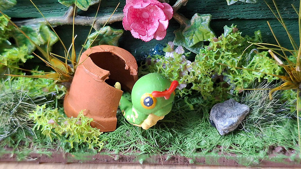 3d printed figure and pot, decorated with various plastic plants and flower beads