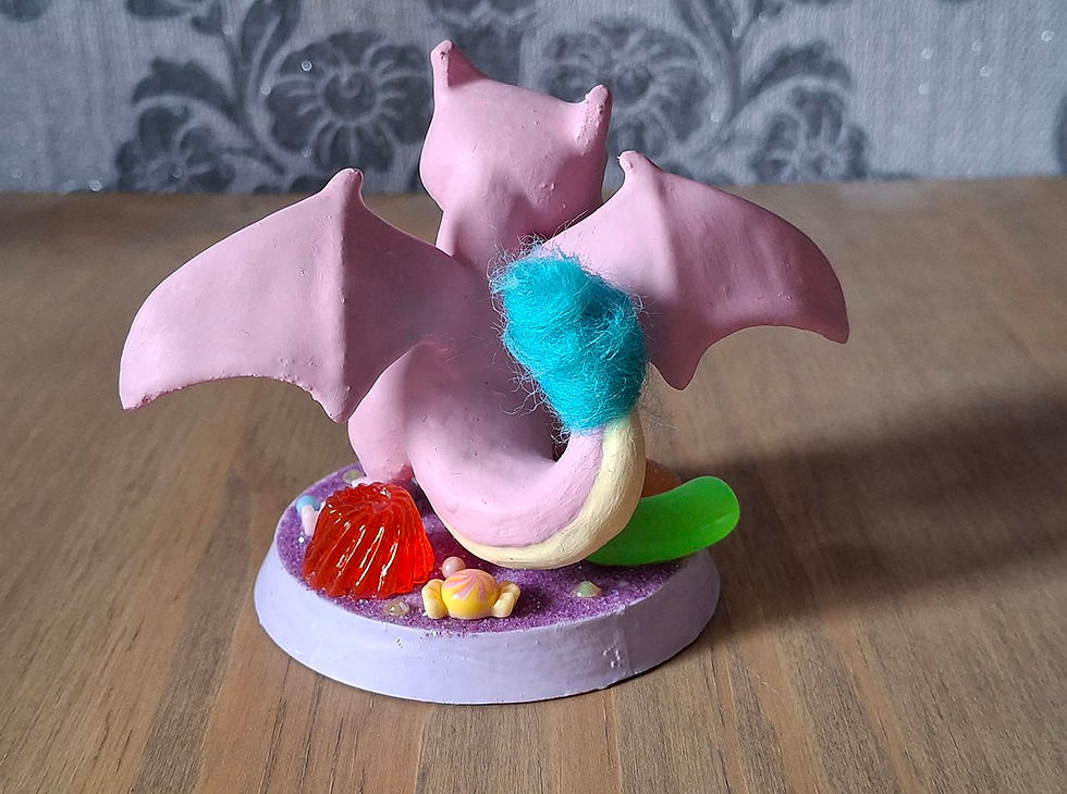3D printed on filament (my pre resin era) and decorated with nail gems and resin jelly sweets from ebay, his candy floss tail is made from felting.